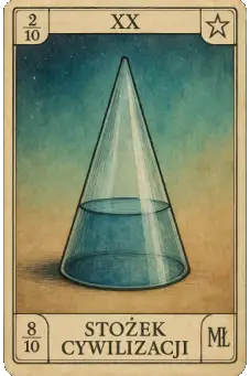 Karta tarota „Stożek Cywilizacji” przedstawia szklaną bryłę stożka wypełnioną do połowy wysokości. Symbolizuje model 2/10–8/10: mniejszość rozumiejąca kierunek (2/10) oraz większość niosącą spokój i równowagę (8/10). Stożek jest metaforą cywilizacji, w której niewielka część świadomości nadaje wektor, a reszta stabilizuje wspólny sen.